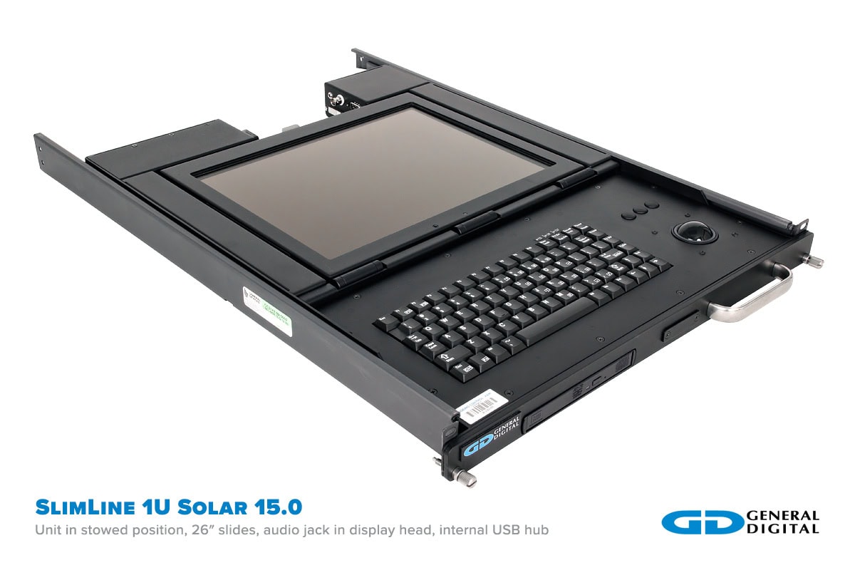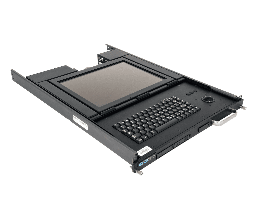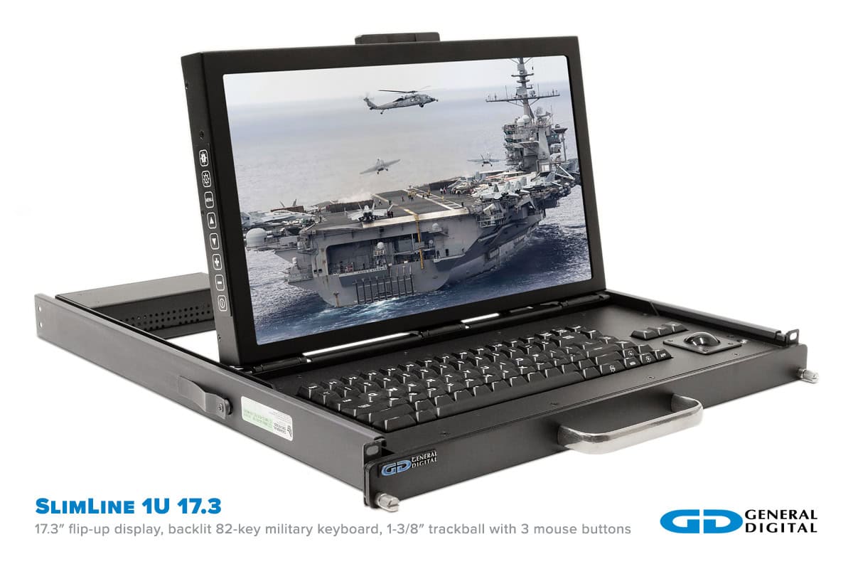 - Rugged flip-up display with built-in keyboard and trackball in 1U high rack mount drawer