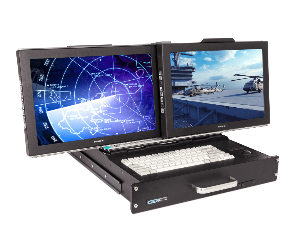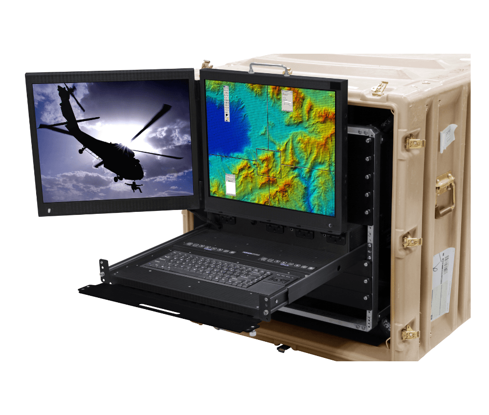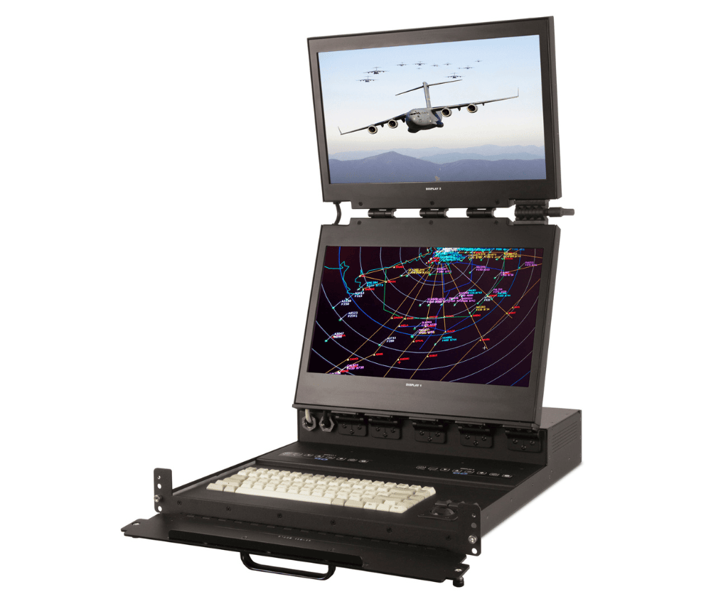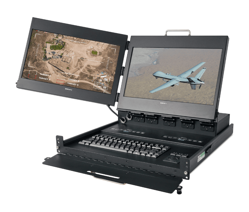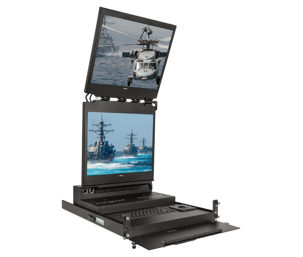 - Rugged 2U/3U high flip-up dual monitors with integral keyboard and pointing device in a rack mount drawer