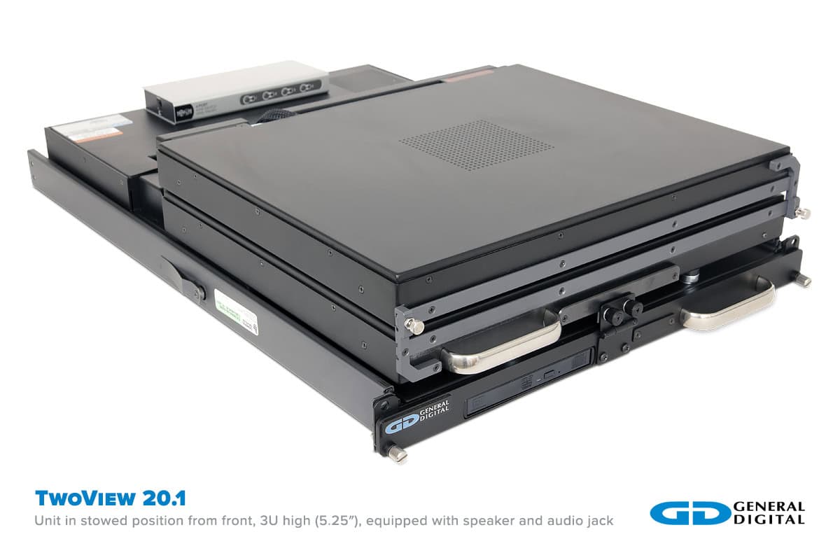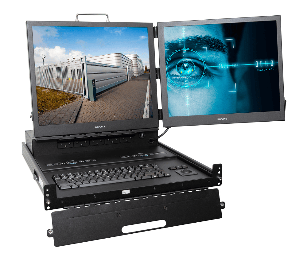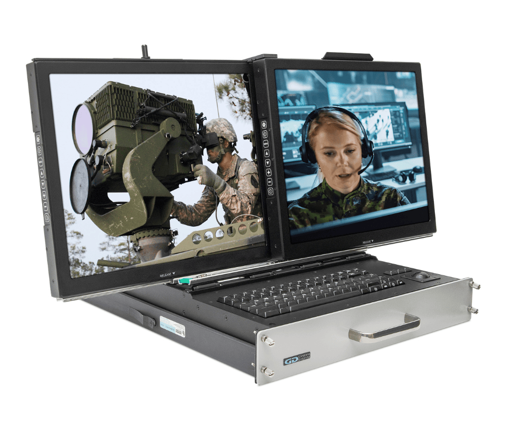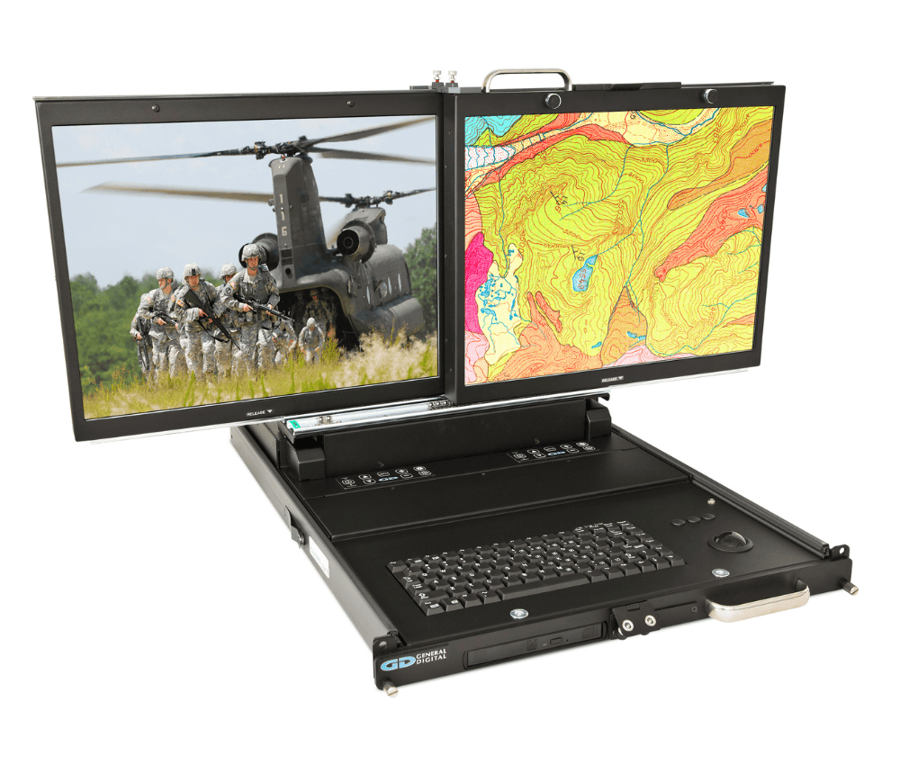 - Rugged 2U/3U high flip-up dual monitors with integral keyboard and pointing device in a rack mount drawer